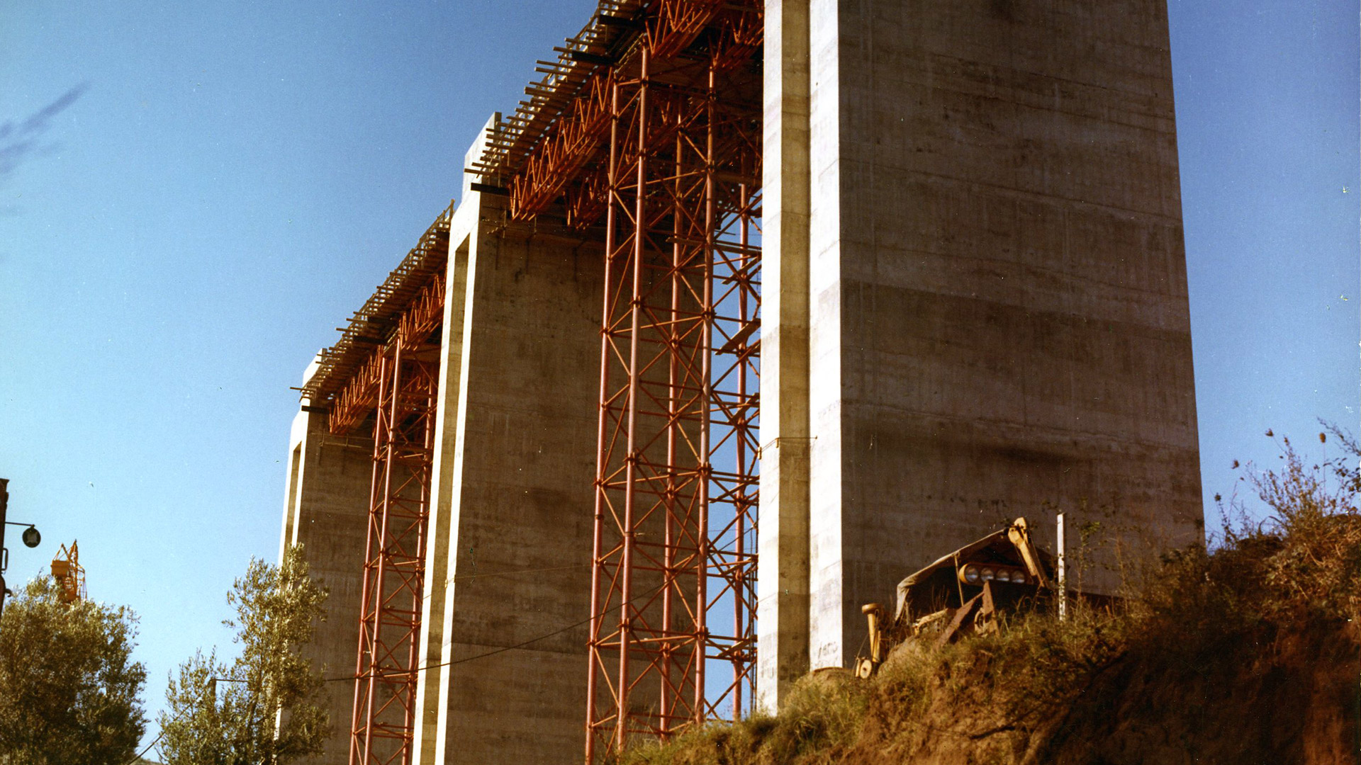 Constructed between 1967 and 1970, it is 1,131 m long. It consists of two different structural types: the first includes 22 spans with 35 m clear beams supported on box piers, the second includes 8 portal spans with a clear span of 44 m each, set into box foundations.