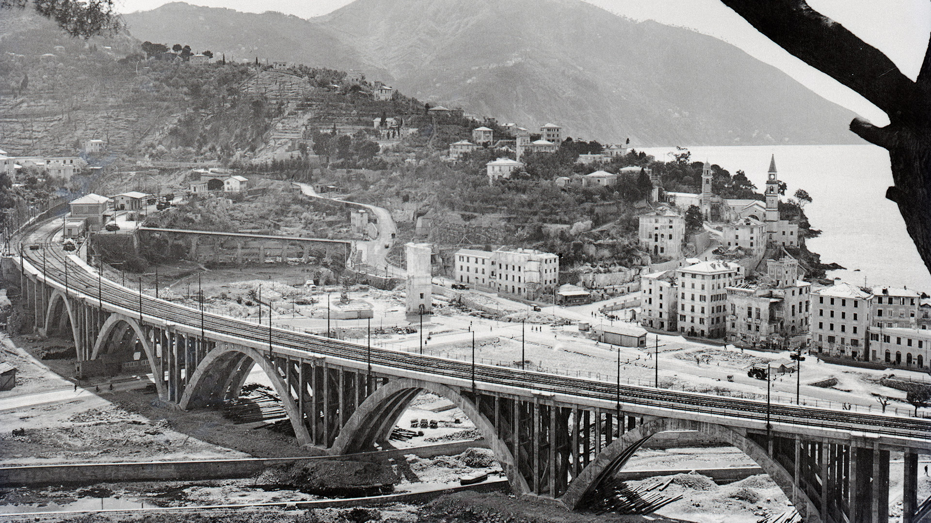 Besides the bridge, the bombings also damaged the railway line. The Recco Station became a crucial node that connected Genoa to Sestri Levante, with its 376 metre-curved bridge, completed in 1922. When the war ended, only 4% of the Recco buildings remained on its feet. To restore railway mobility a 6km temporary bridge was built (a single track one, in wood and steel H-beams). It was very noisy but safe, thanks to workers who every two months tightened every bolt.