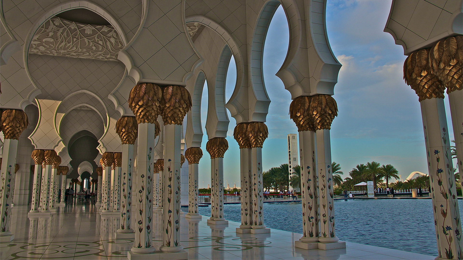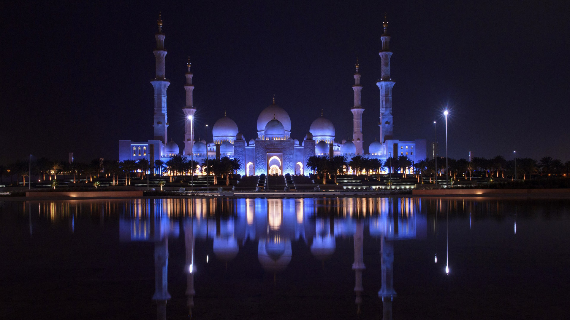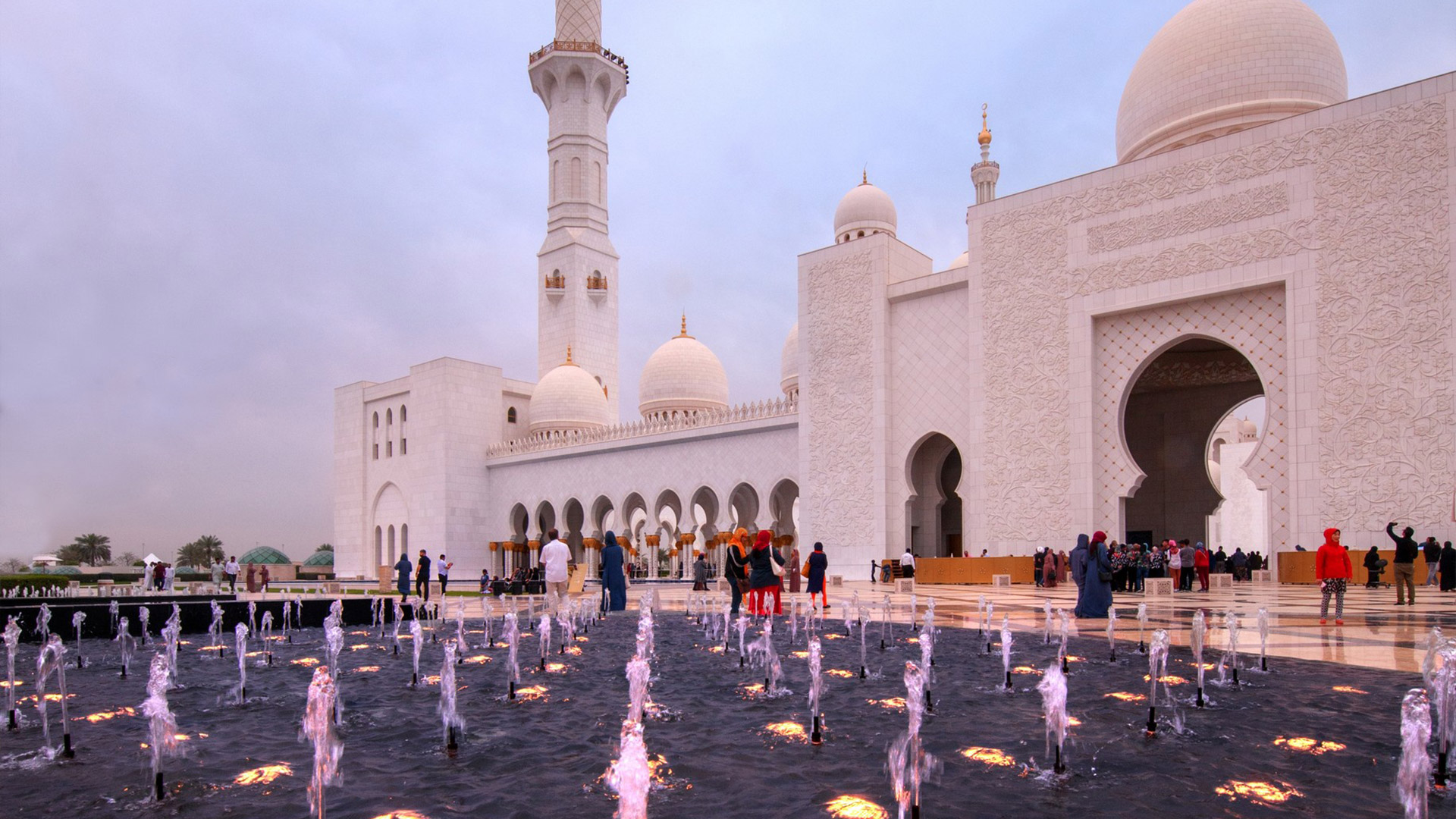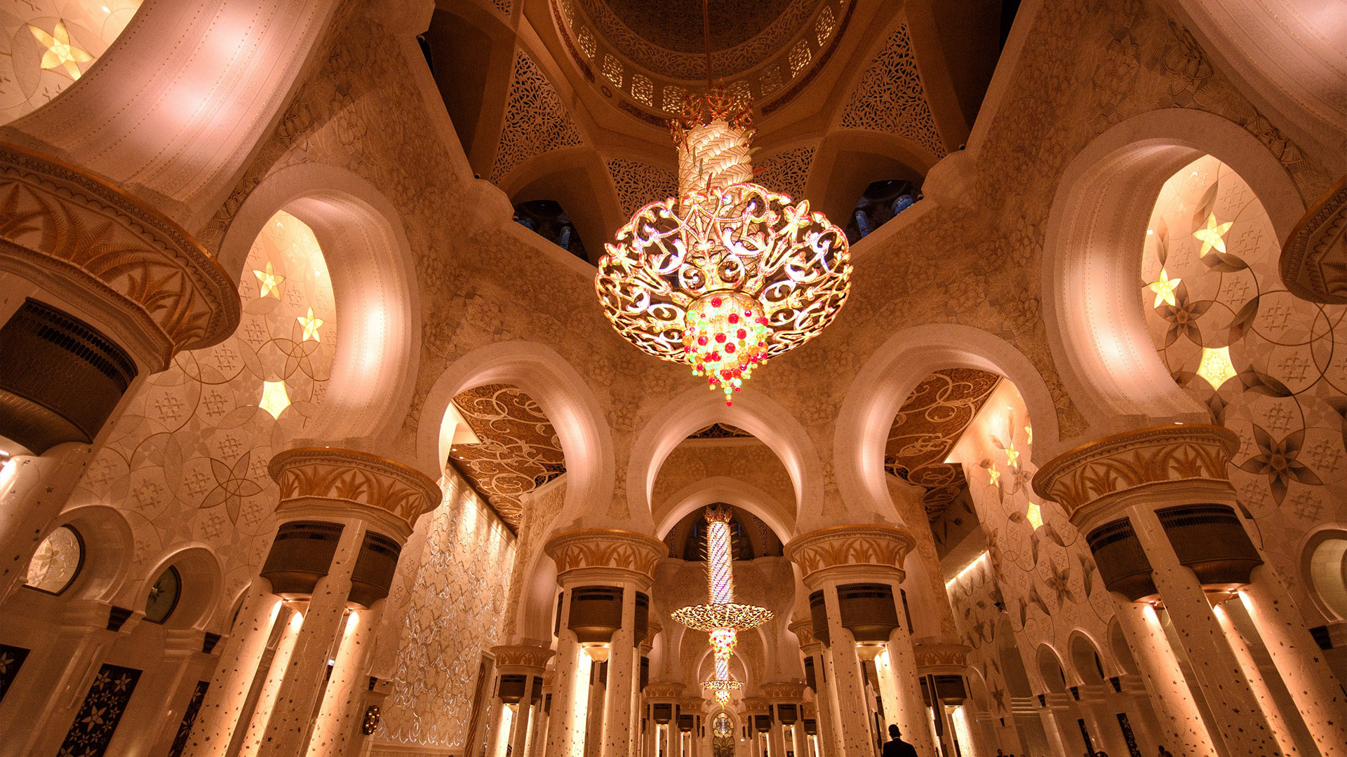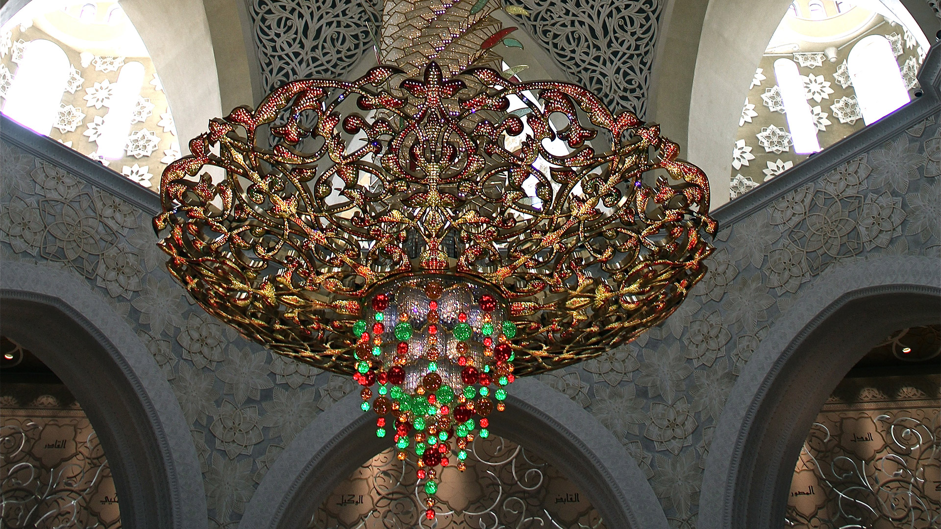 Specchi d’acqua lungo i portici riflettono le colonne, illuminate la notte con luci colorate che insieme a proiezioni luminose grigio-blu sulle pareti evocano le fasi lunari. La sala centrale (7.000 posti) è da Guinness dei primati: ha il tappeto annodato più grande del mondo (trasportato dall’Iran con 3 aerei) e il candeliere più massiccio del pianeta (10 metri di diametro e 15 metri di altezza per 12 tonnellate di peso), circondato da 20 candelieri d’oro.