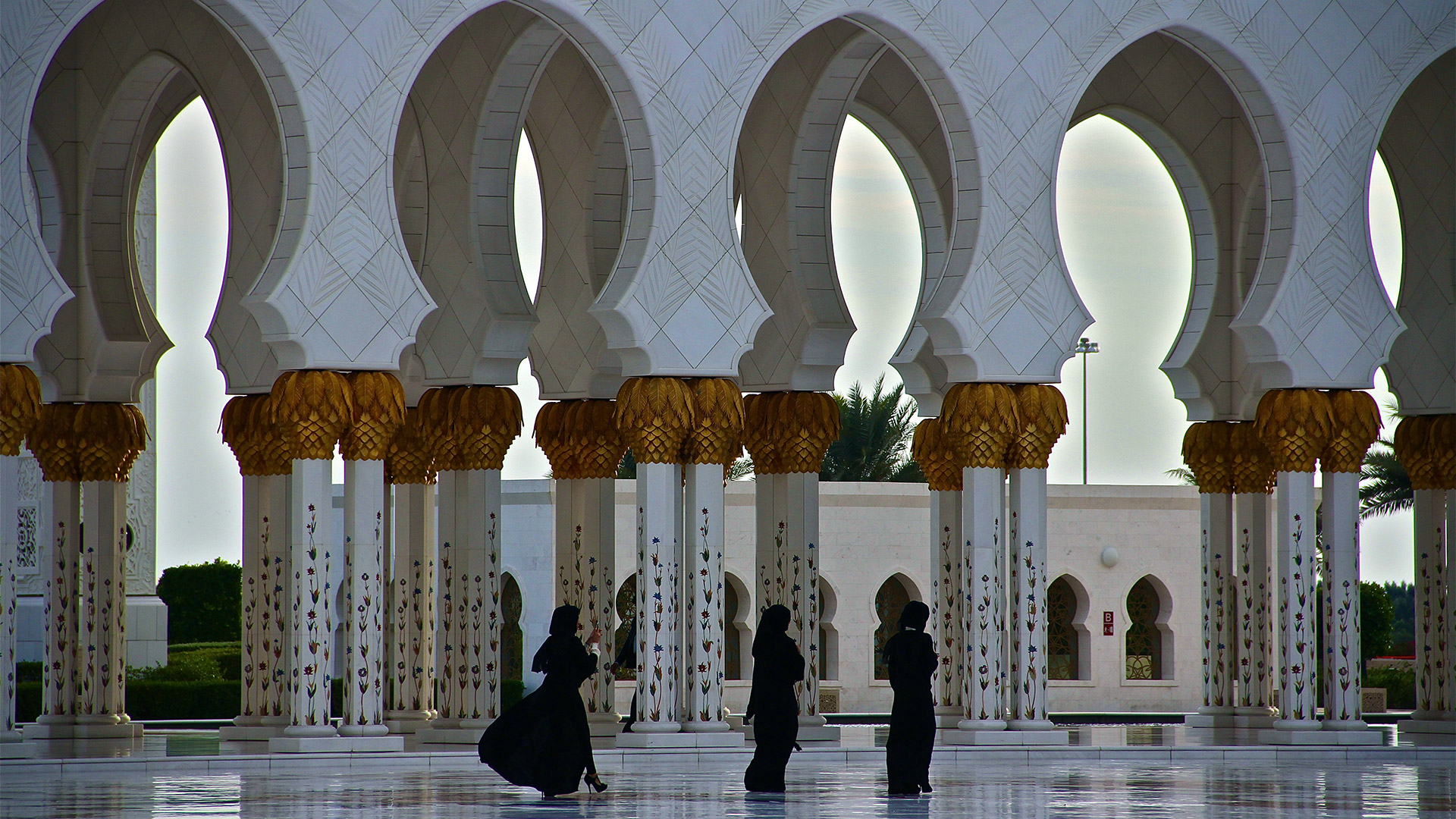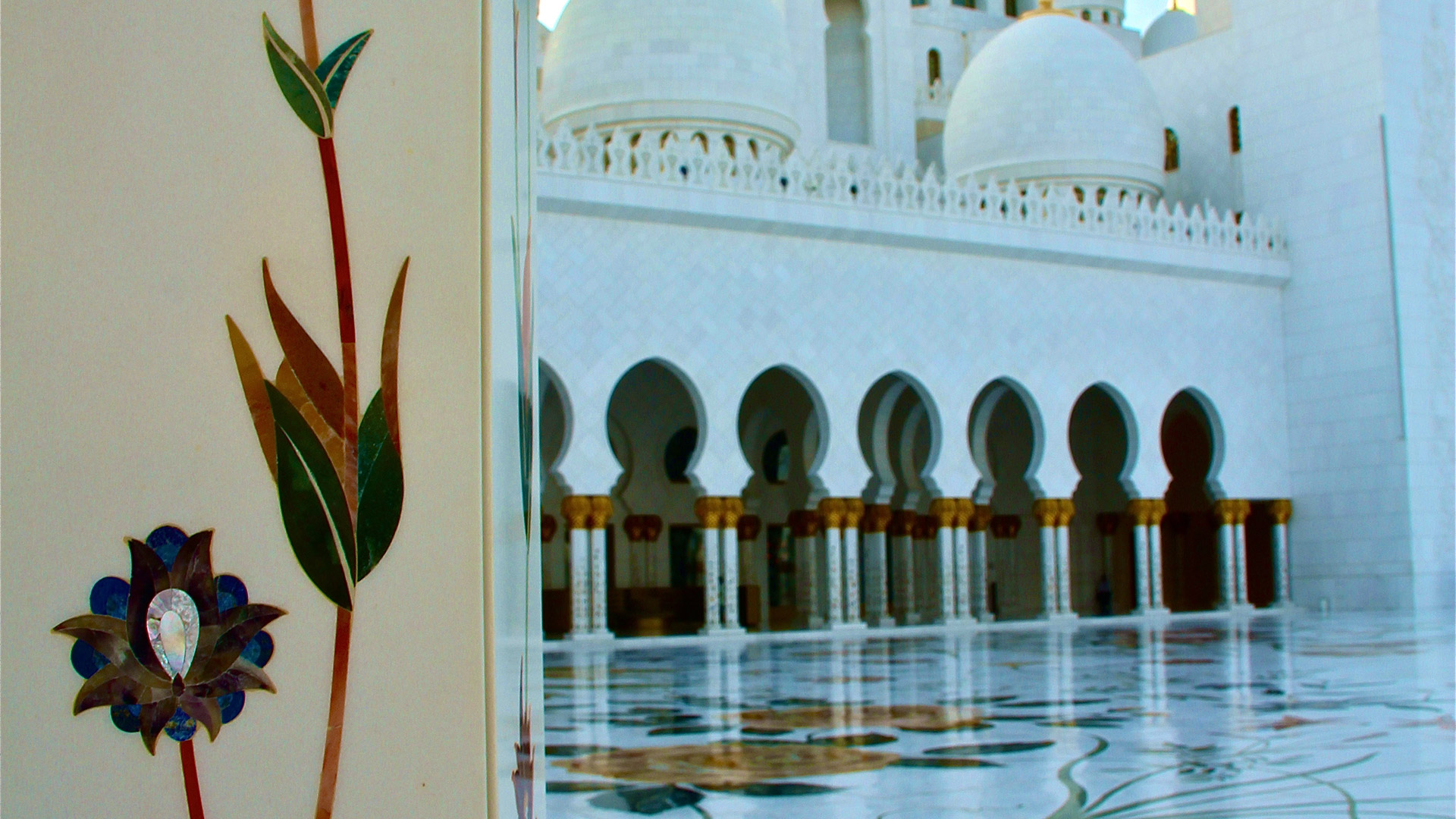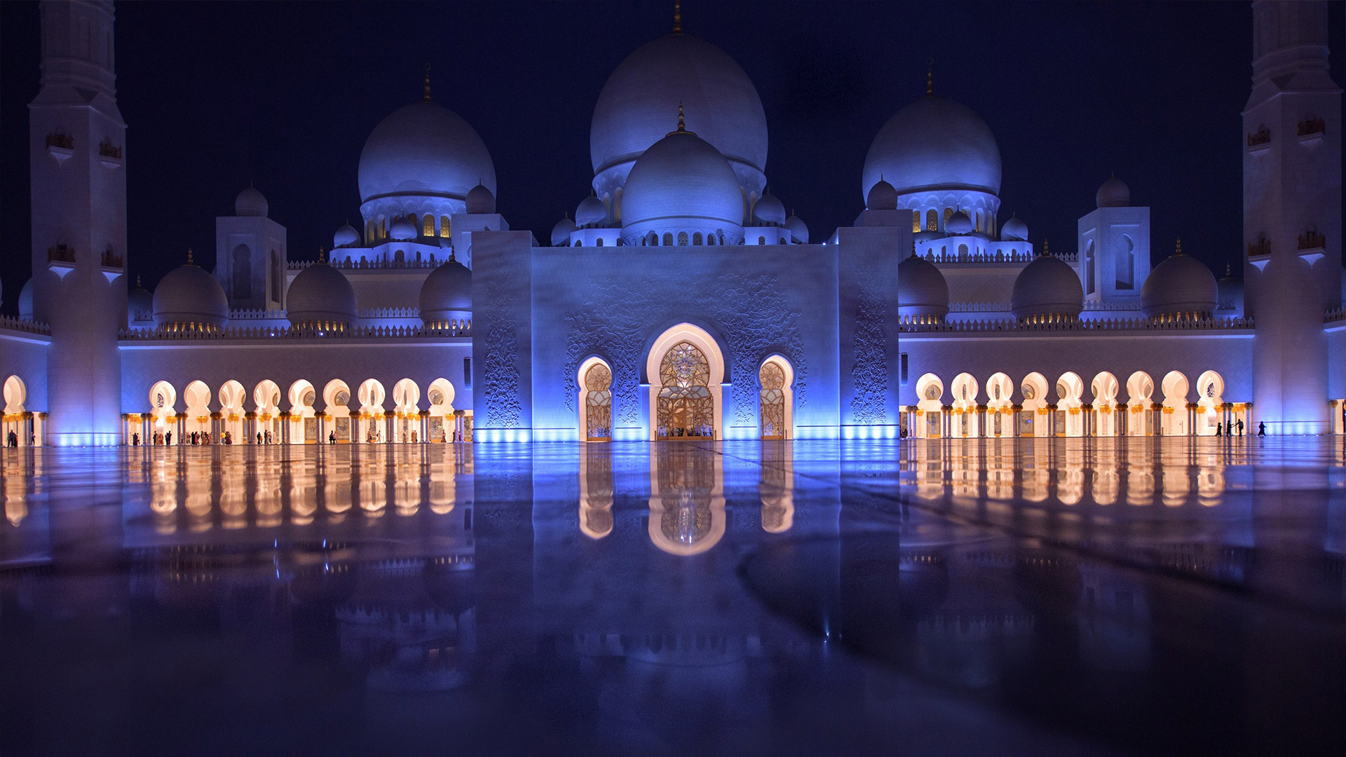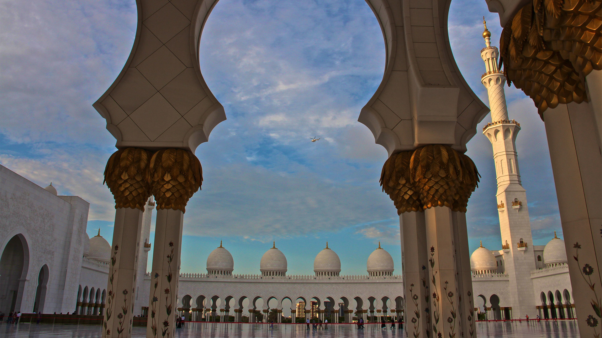 Specchi d’acqua lungo i portici riflettono le colonne, illuminate la notte con luci colorate che insieme a proiezioni luminose grigio-blu sulle pareti evocano le fasi lunari. La sala centrale (7.000 posti) è da Guinness dei primati: ha il tappeto annodato più grande del mondo (trasportato dall’Iran con 3 aerei) e il candeliere più massiccio del pianeta (10 metri di diametro e 15 metri di altezza per 12 tonnellate di peso), circondato da 20 candelieri d’oro.