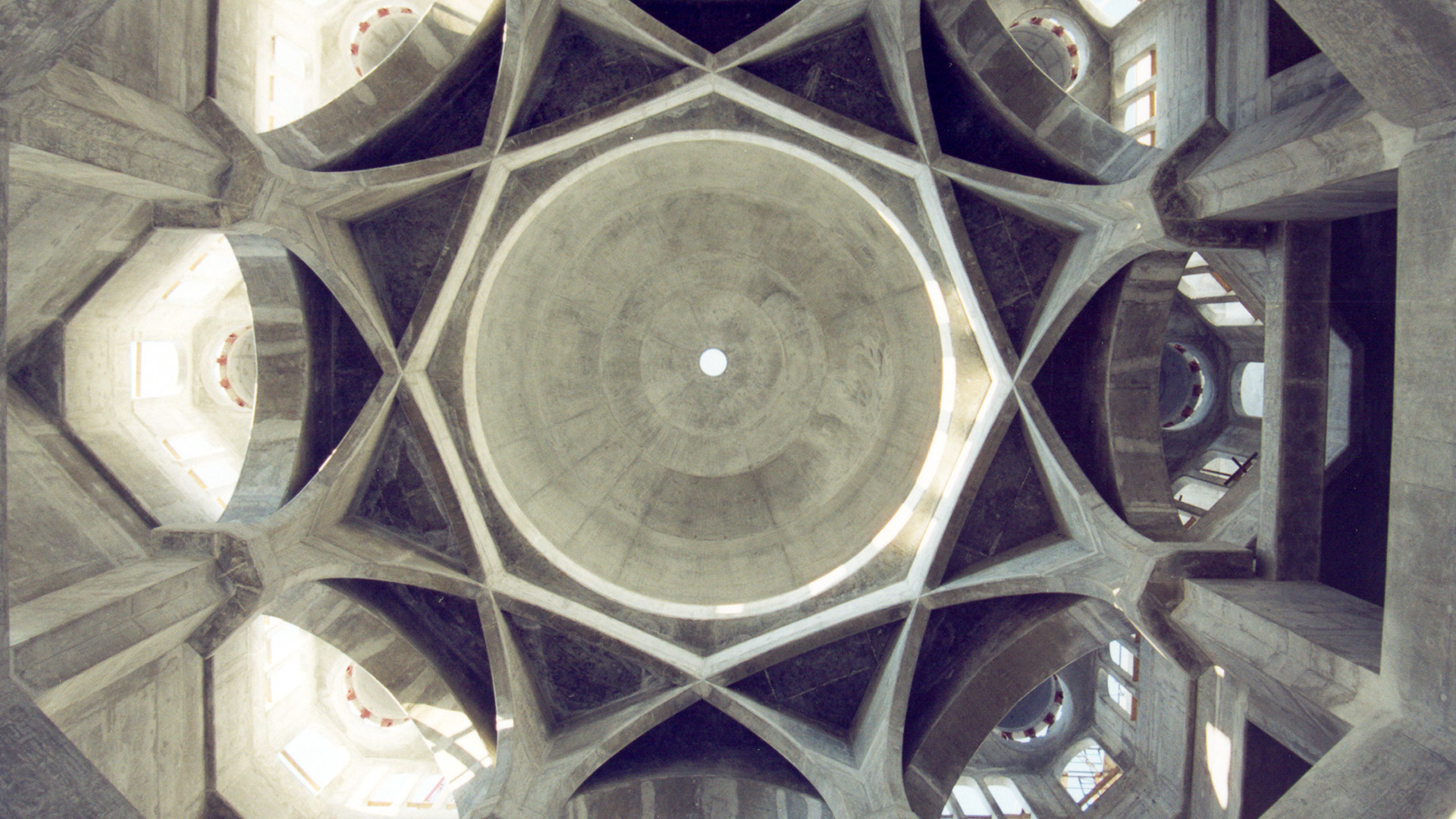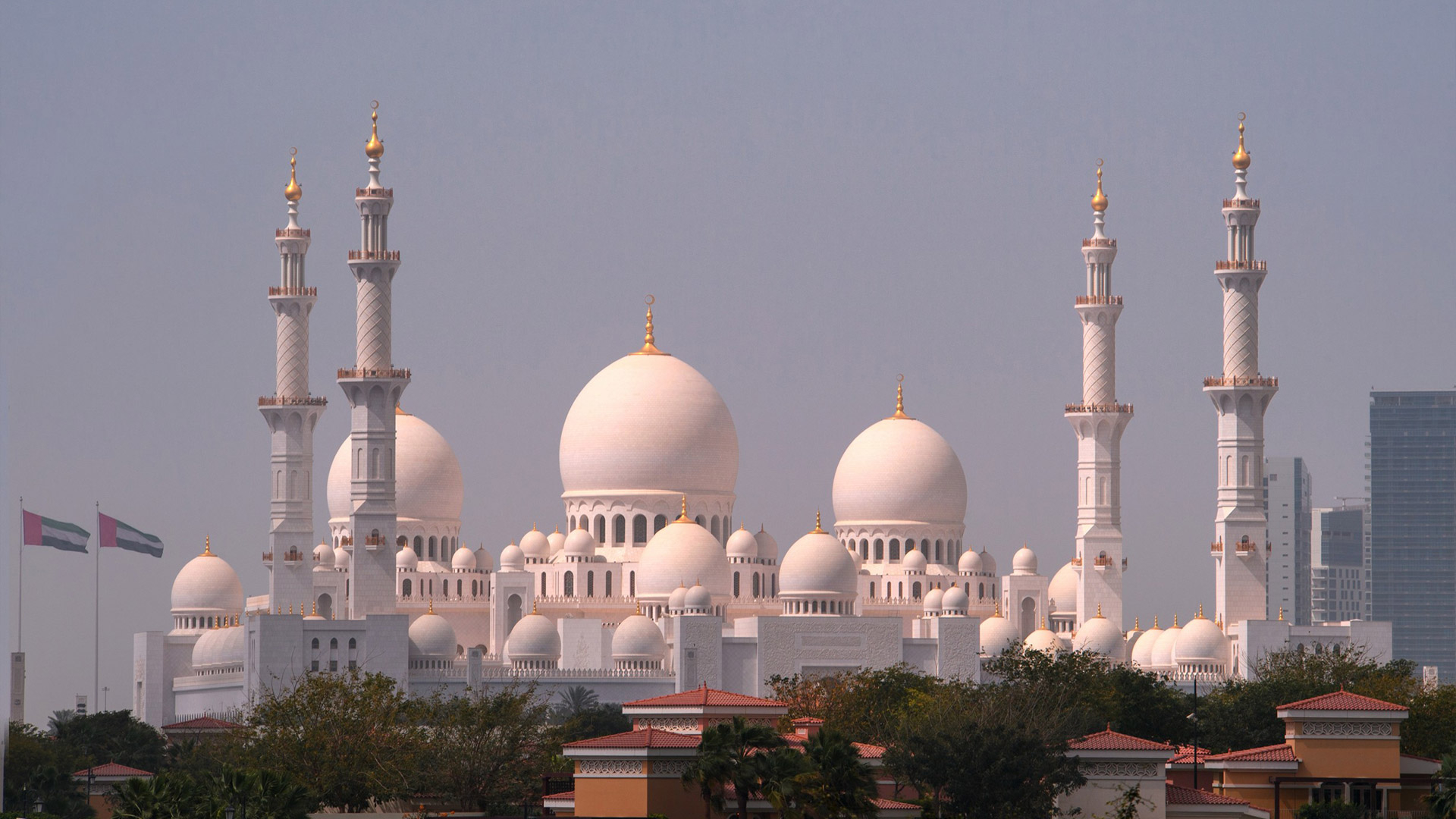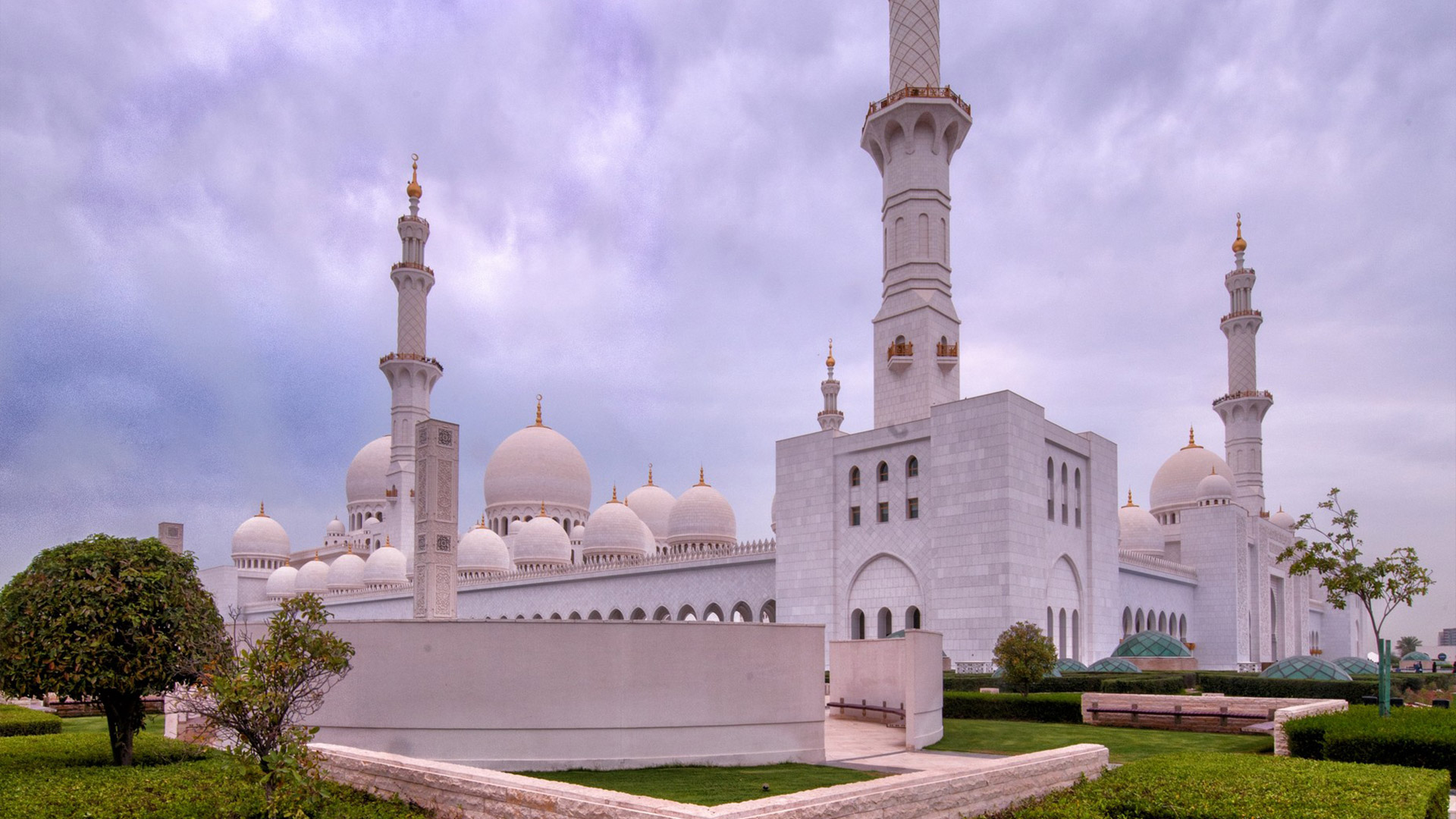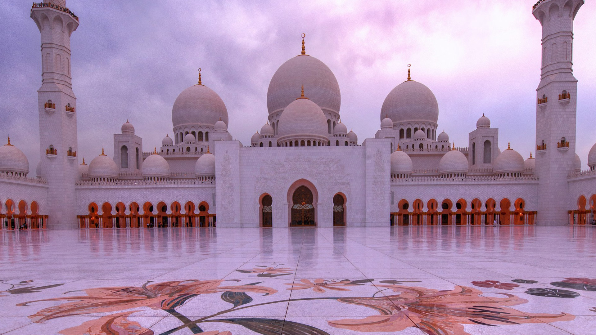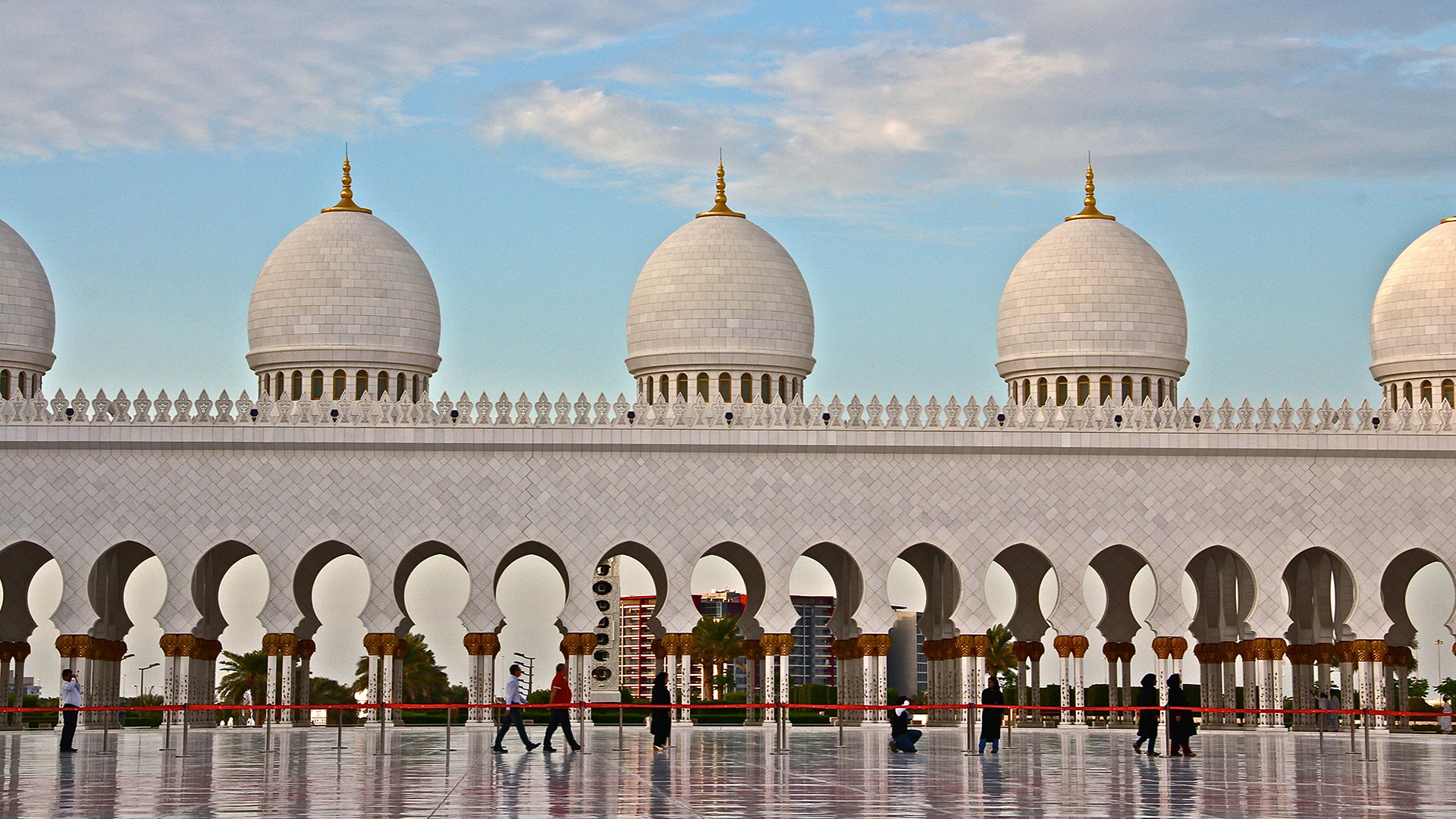 Specchi d’acqua lungo i portici riflettono le colonne, illuminate la notte con luci colorate che insieme a proiezioni luminose grigio-blu sulle pareti evocano le fasi lunari. La sala centrale (7.000 posti) è da Guinness dei primati: ha il tappeto annodato più grande del mondo (trasportato dall’Iran con 3 aerei) e il candeliere più massiccio del pianeta (10 metri di diametro e 15 metri di altezza per 12 tonnellate di peso), circondato da 20 candelieri d’oro.