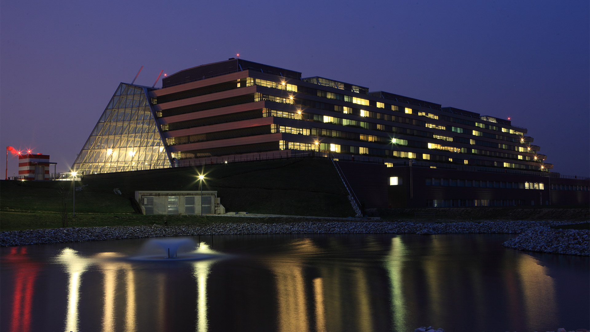 L'ospedale, alto 31 metri e con un volume di circa 619.000 m3, dispone di 580 posti letto, 350 camere, 20 culle e 20 sale operatorie. La struttura, a forma di tronco piramidale, si divide in due blocchi collegati da una facciata fono-assorbente di vetro e acciaio, lunga 180 metri, che garantisce isolamento termico e acustico e luce naturale. La hall interna presenta un giardino pensile con un microclima ottimale.