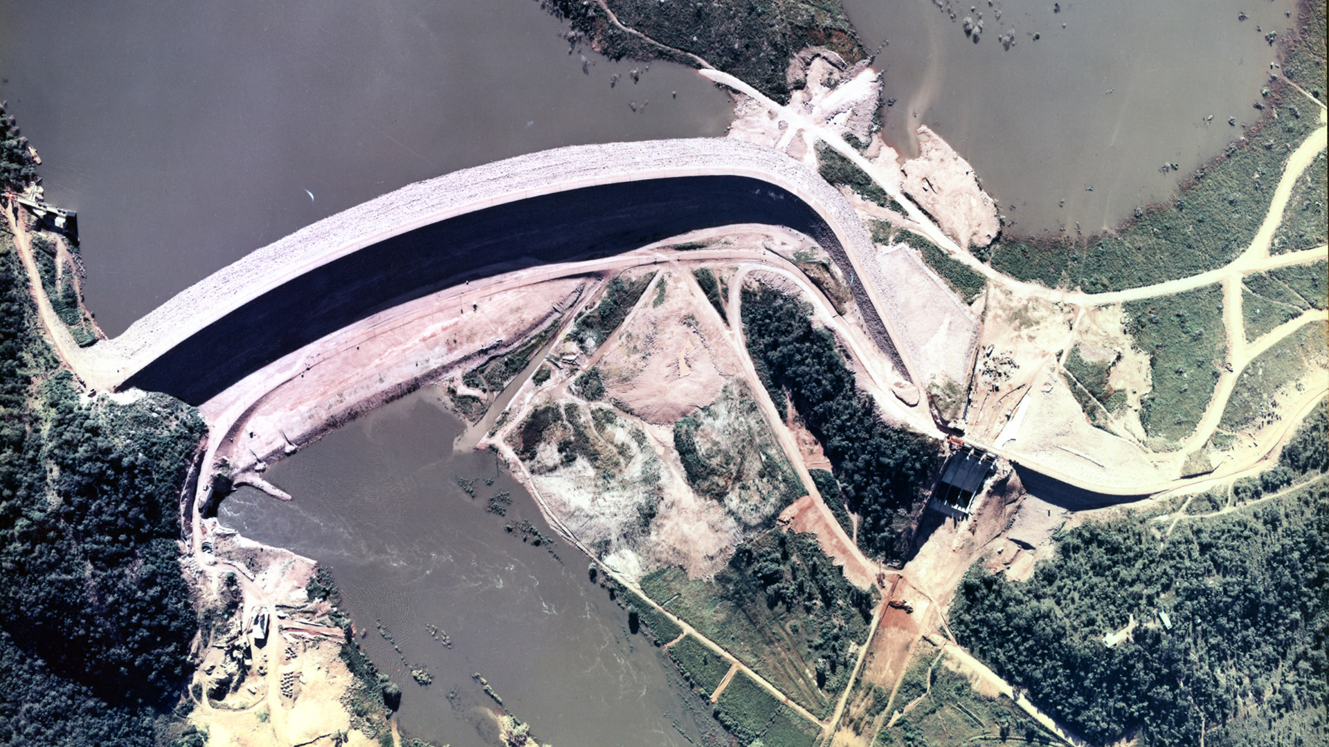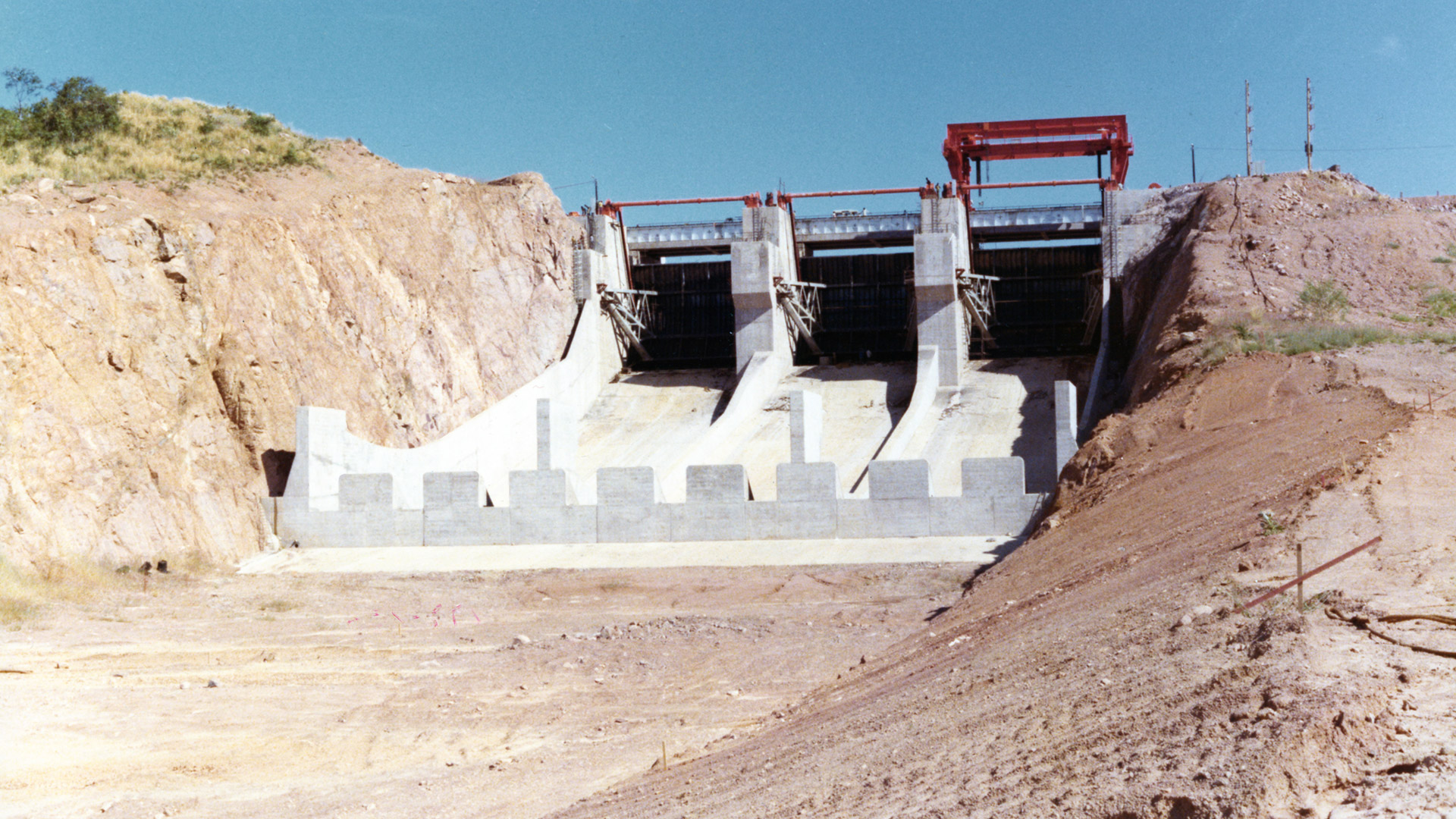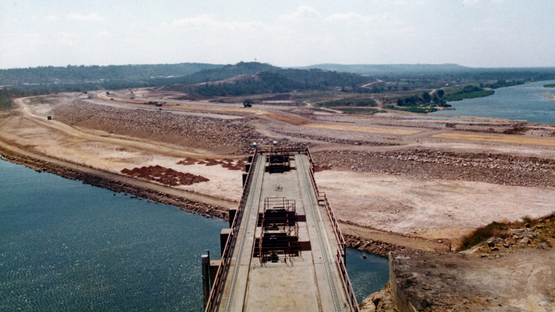 Nella seconda metà del 1975 è iniziata la posa del rilevatore diga in alveo, che giunge a coronamento nel novembre 1976. La progettazione della diga, che è del tipo a scogliera con nucleo impermeabile di laterite argillosa, è influenzata dalla sismicità della zona, dall' impossibilità di raggiungere con le fondazioni la roccia granitica troppo profonda, e quindi dalla necessità di appoggiare il nucleo stesso della diga su argilloscisti (mudstone). Oltre allo sbarramento principale che ha una lunghezza di 1.500 m e un'altezza massima di 55 m, è stata realizzata anche una diga ausiliaria in scogliera.