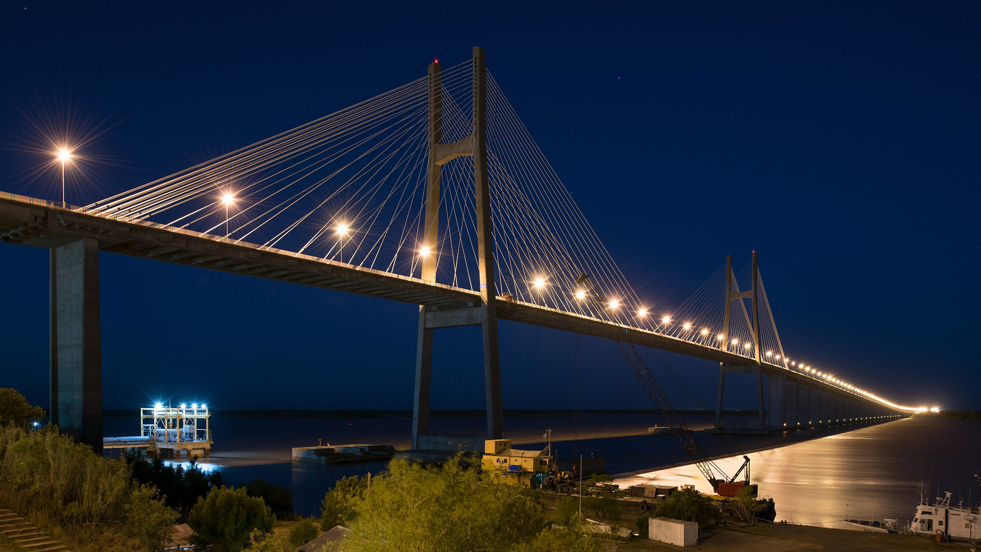 L’opera, composta da ponti, viadotti e tratti interrati, attraversa il corso principale del fiume e atterra su diverse isole del delta del Paraná.