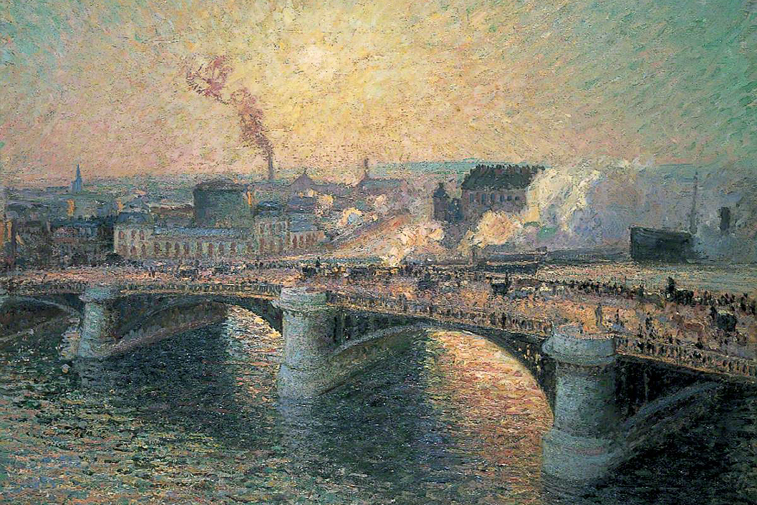 Un dipinto del 1896 del maestro dell’impressionismo Camille Pissarro. Ne fece altri di questo ponte, ma anche del circondario. Amava quei luoghi.