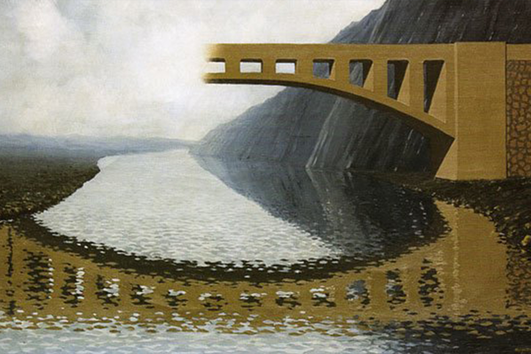 Per il maestro della “illusione” in pittura, un ponte che potrebbe vivere nei nostri sogni: è interrotto? Nascosto? La metà a sinistra non c’è, ma si vede riflessa.